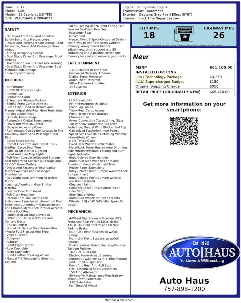 This Prestige Cabriolet checks all the boxes! It has every option (except perhaps the Alu Optic package which doesn't even make sense on this color - Sepang Blue). The highlights include adaptive suspension, sport differential, adaptive cruise control, adaptive steering, adaptive exhaust, etc. The list goes on and on. What makes this car stand out is the combination of a center differential (built into the transmission) and a rear sport differential that uses clutch packs (not brakes) to distribute power left to right. The result is phenomenal, especially when powering through tight turns. Imagine sending 80% of power to the rear and then 100% of that to the outside wheel... without applying brakes! Once you experience this, nothing else will do. I had this before in a coupe version. I don't know what I can get next. Maybe an S6 or S8. I love my ventilated seats and it's so hard to find Audis that have them, even high end models. The combination of ventilated seats, rear sport diff, and adaptive suspension is even more rare. I get asked by random people to sell it to them every month but I can't because it was so hard to find this one. The APR tune is a must. Unlocking that extra 100hp / 130lbft is the icing on the cake. The car has been trouble free in these first 50k miles but I do worry about long term cost of ownership. Audi service is not cheap and some of the engine's critical components are made of cheap plastic (e.g., the water pump) and/or are sitting inside the V, underneath the supercharger (think 6-8 hours of labor each time).… - 5.0