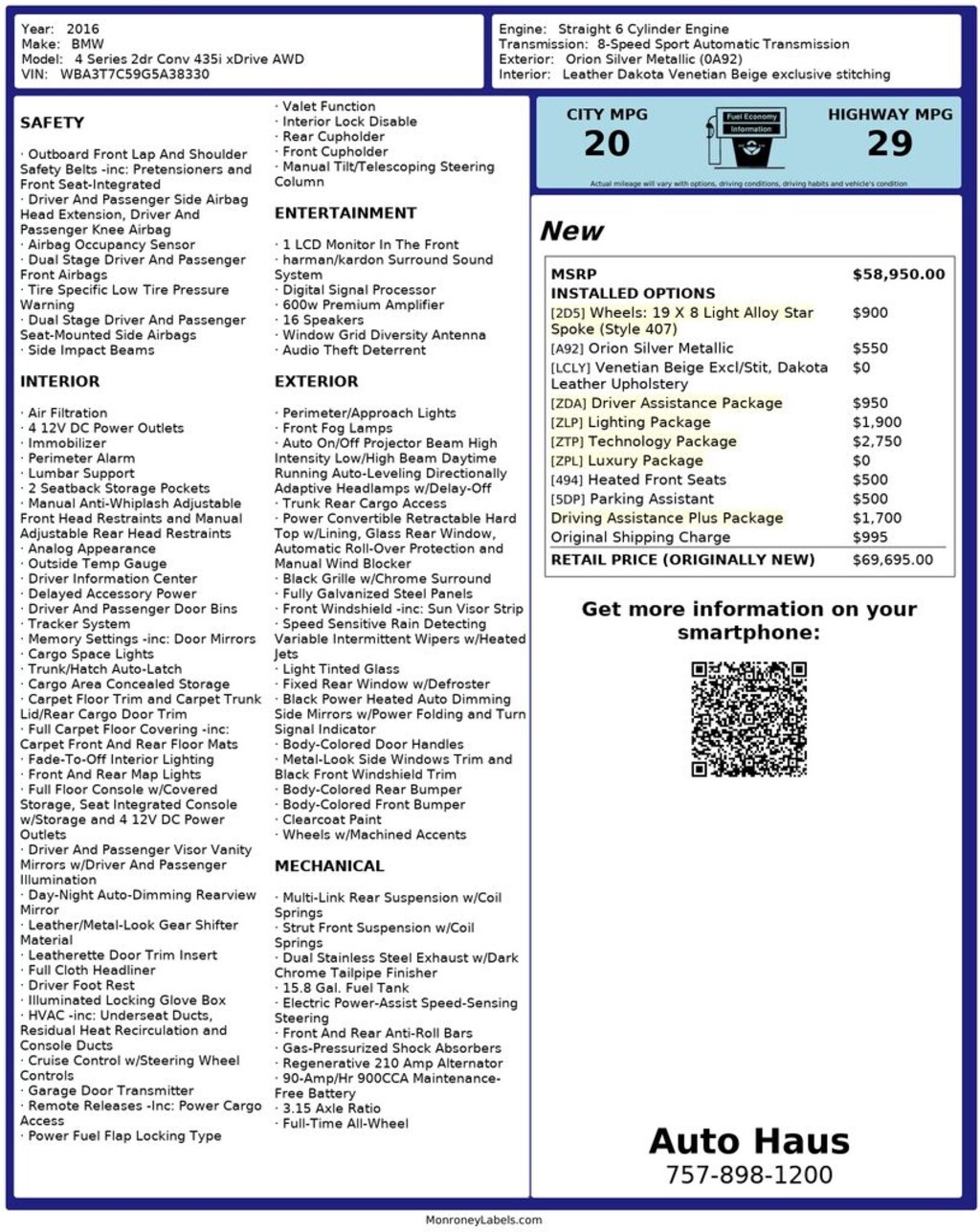 2016 BMW 4 Series 435i xDrive Orion Silver Metallic AWD 8-Speed Automatic 3.0L I6 DOHC 24V TwinPower Turbo Clean CARFAX.