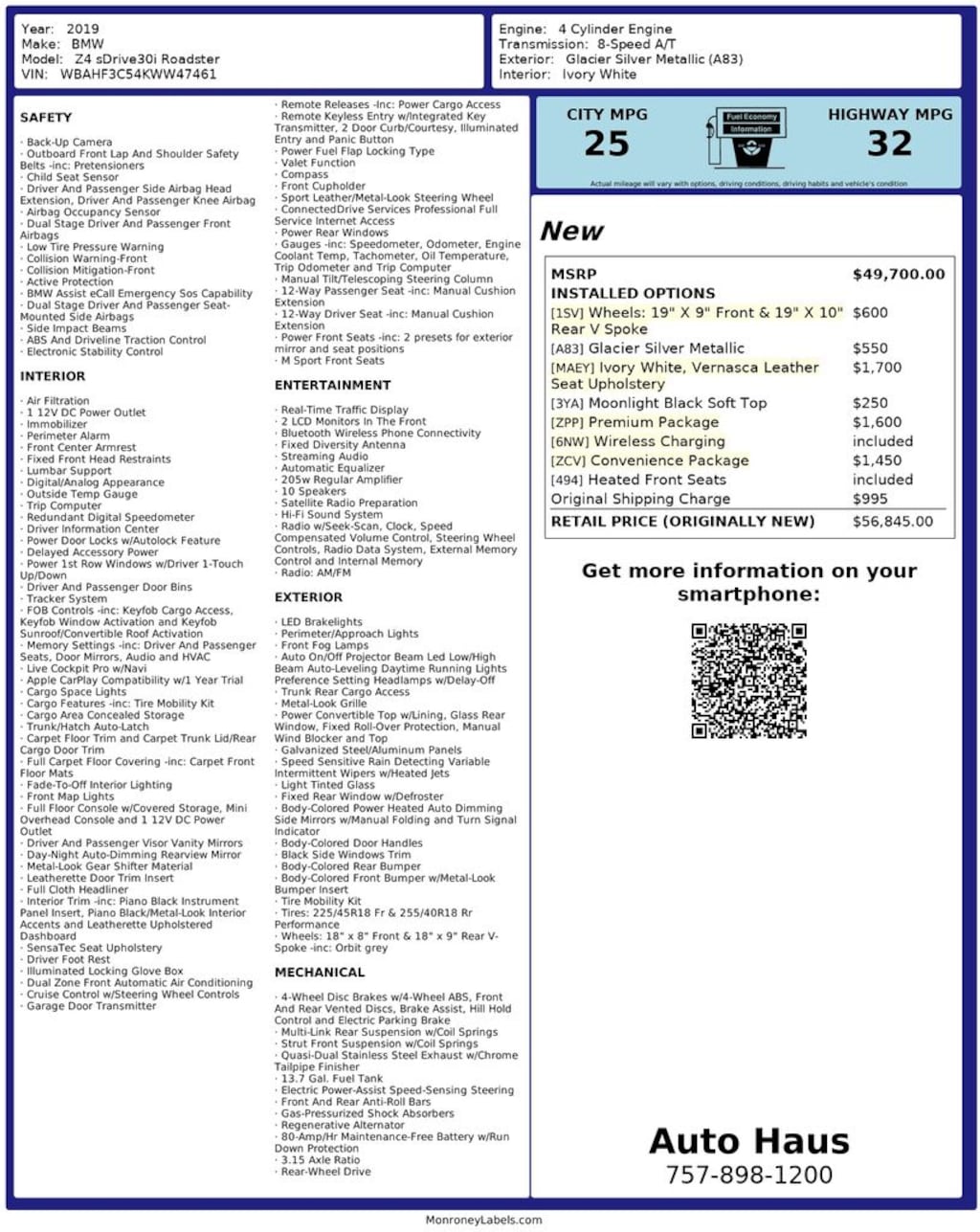 This 2019 BMW Z4 sDrive30i delivers classic open-air driving with modern BMW performance and technology. Finished in Glacier Silver Metallic with an Ivory White leather interior and Moonlight Black soft top, this Z4 is an elegant and engaging roadster built for driving enthusiasts.
