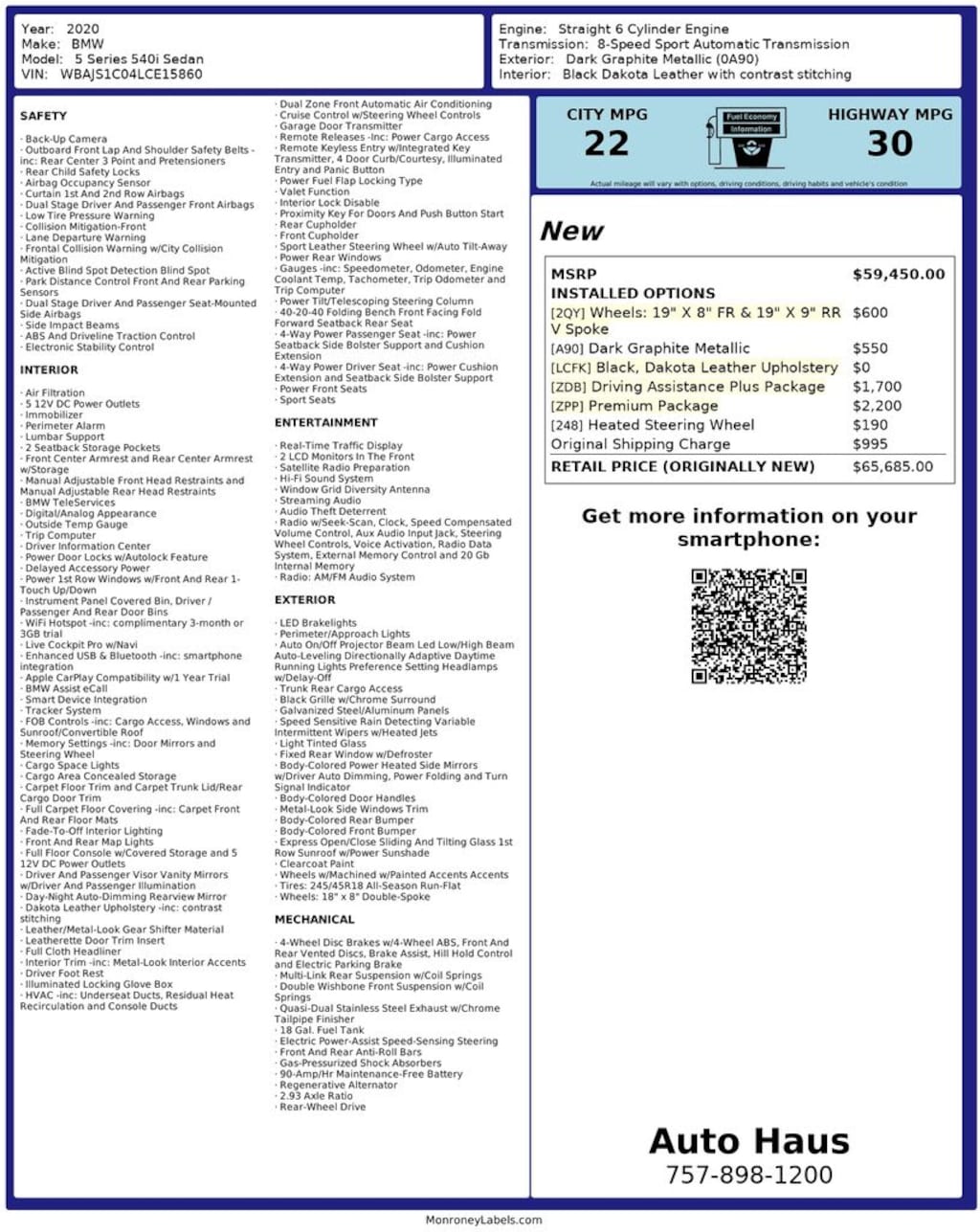 2020 BMW 5 Series 540i Dark Graphite Metallic RWD 8-Speed Automatic 3.0L I6 Turbocharged DOHC 24V LEV3-ULEV70 335hp