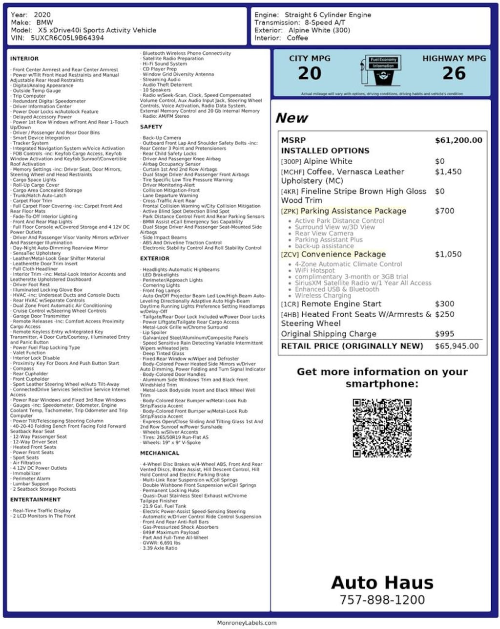 The interior is finished in rich Coffee leather seating and features 4-zone automatic climate control, wireless charging, and a WiFi hotspot for modern convenience. Technology highlights include Apple CarPlay compatibility, BMW Navigation, enhanced USB & Bluetooth connectivity, and SiriusXM® Satellite Radio with 1-Year All Access.