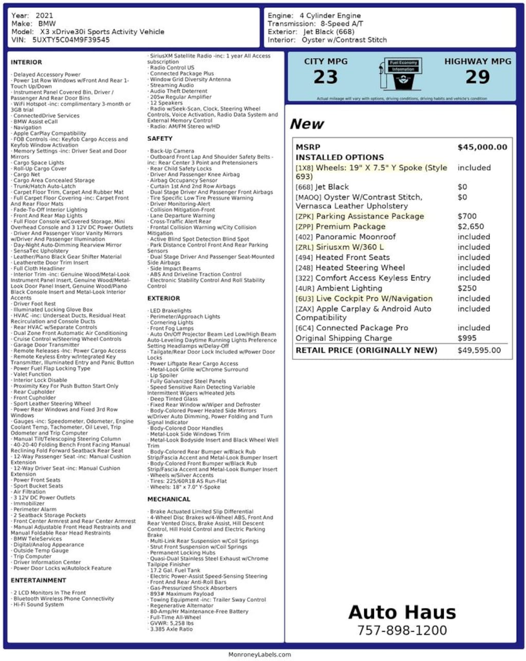 2021 BMW X3 xDrive30i Jet Black AWD 8-Speed Automatic Sport 2.0L I4 TwinPower Turbo CARFAX One-Owner.