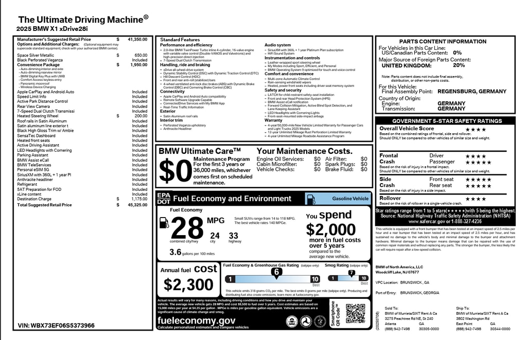 This CARFAX One-Owner, Clean CARFAX 2025 BMW X1 xDrive28i delivers contemporary BMW design, advanced technology, and confident all-weather performance. Powered by a responsive 2.0L TwinPower Turbo inline-4 paired with a 7-Speed Automatic transmission and BMWâs intelligent xDrive all-wheel drive, this compact luxury SUV is both efficient and engaging to drive.
