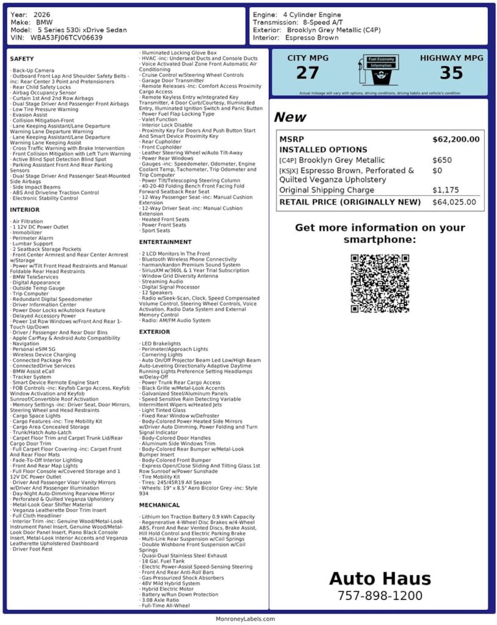This 2026 BMW 530i xDrive represents the next generation of BMW luxury and innovation, combining advanced driver assistance, M Sport performance design, and premium comfort features. Finished in Brooklyn Grey Metallic with an Espresso Brown premium synthetic interior, this exceptionally well-equipped 5 Series delivers an elevated driving experience with confident all-wheel-drive capability.