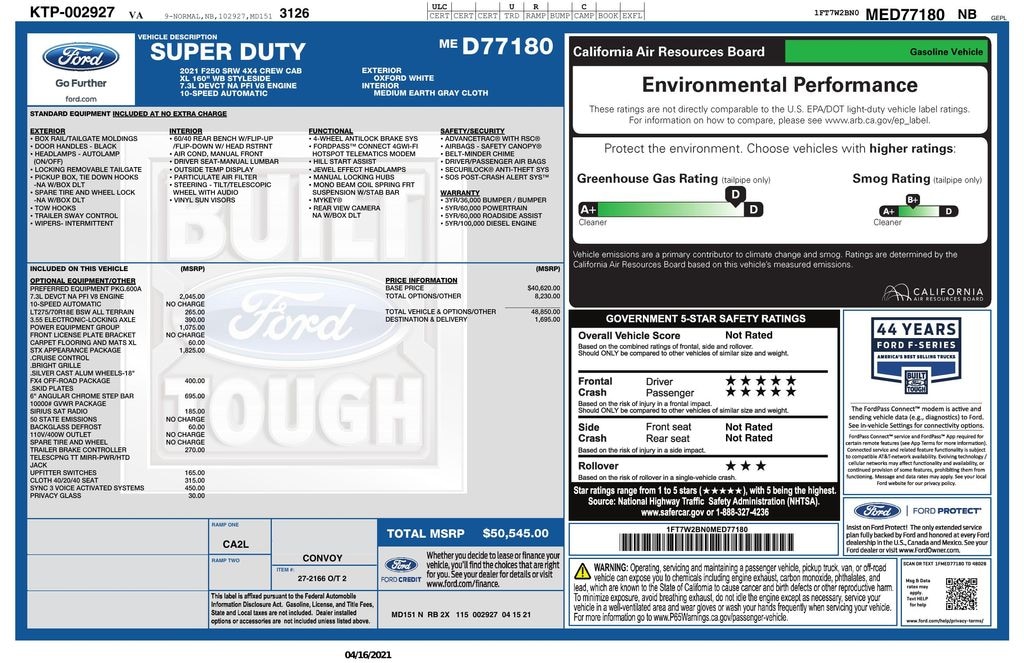 Built for serious work and weekend adventures, this 2021 Ford F-250 Super Duty XL 4WD delivers massive capability with the legendary 7.3L V8 âGodzillaâ engine and a smooth 10-Speed Automatic transmission. Finished in Oxford White and equipped with the FX4 Off-Road Package, this heavy-duty truck is ready to tackle tough jobs, off-road trails, or haul with confidence.