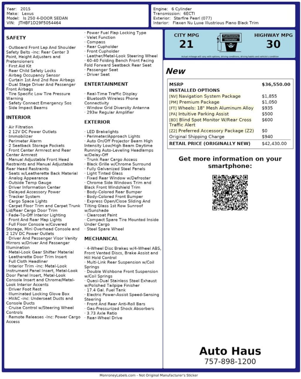 2015 Lexus IS 250 Starfire Pearl RWD 6-Speed Automatic Electronic with ECT-i 2.5L V6 DOHC 24V VVT-i