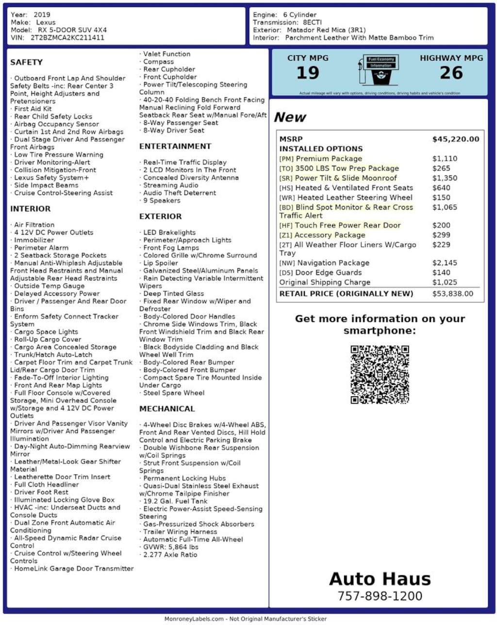 Experience legendary reliability and refined luxury with this 2019 Lexus RX 350. Finished in eye-catching Matador Red Mica with a premium Parchment interior, this SUV delivers a smooth, quiet ride with upscale comfort and proven performance.