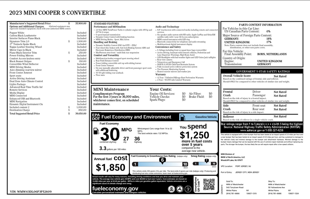 Powered by a responsive 2.0L DOHC Turbocharged I4 paired with a smooth 7-Speed Automatic Transmission, the Cooper S delivers sharp handling and energetic acceleration while maintaining impressive efficiency at 27 MPG City / 36 MPG Highway.