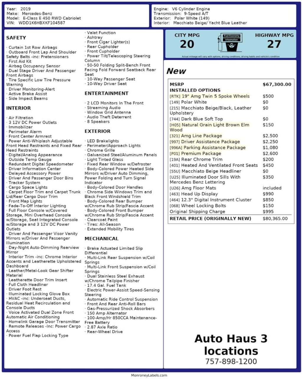2019 Mercedes-Benz E-Class E 450 Polar White RWD 9-Speed Automatic 3.0L V6 BiTurbo Clean CARFAX.