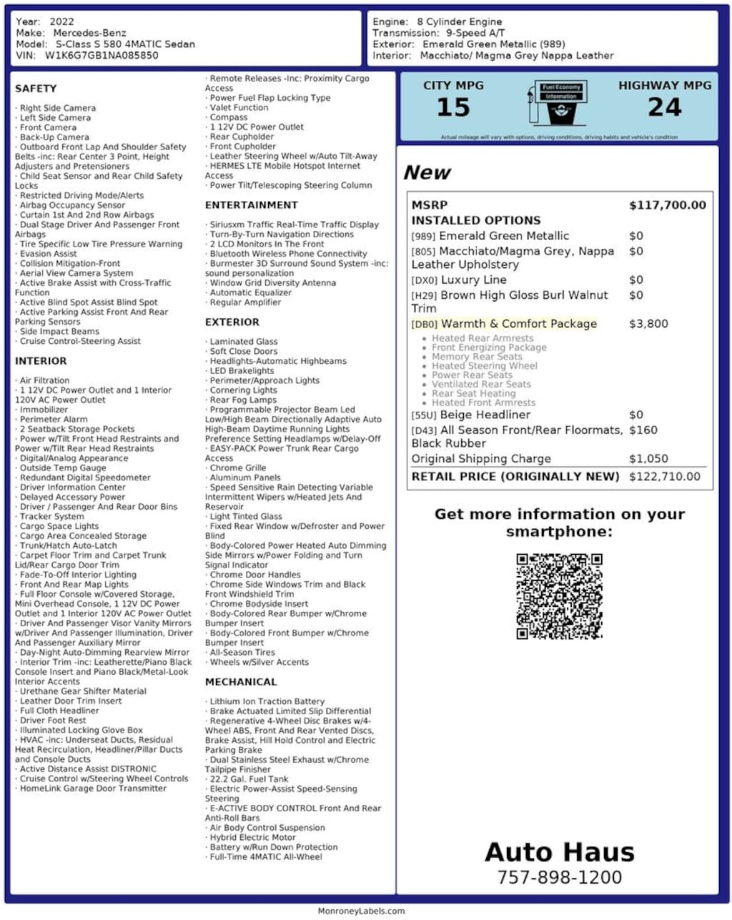 2022 Mercedes-Benz S-Class S 580 4MATIC® Emerald Green Metallic 4MATIC® 9-Speed Automatic 4.0L V8 CARFAX One-Owner.