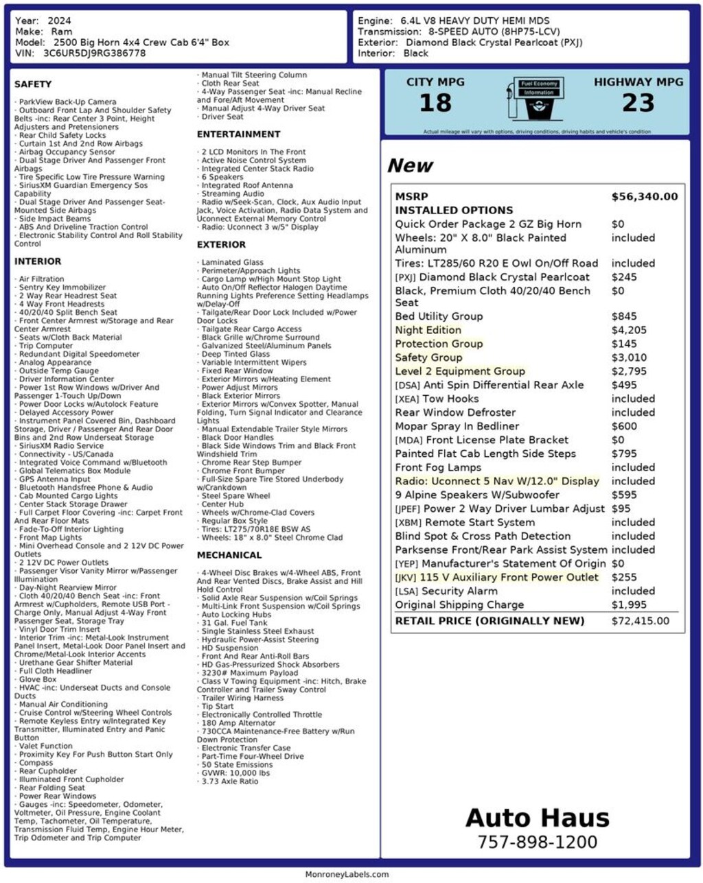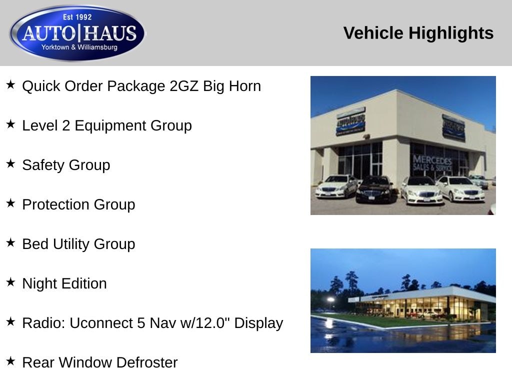 This 2024 Ram 2500 Big Horn combines heavy-duty capability with upscale comfort and advanced safety technology. Finished in Diamond Black Crystal Pearlcoat and equipped with the Night Edition and Level 2 Equipment Group, this truck is equally suited for demanding work and refined daily driving.