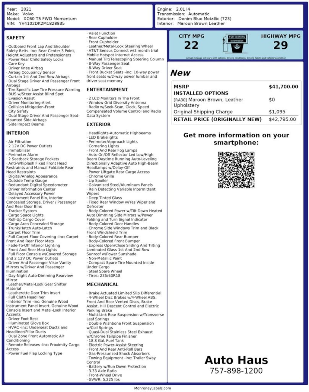 2021 Volvo XC60 T5 Momentum Denim Blue Metallic FWD Automatic with Geartronic I4 Clean CARFAX.