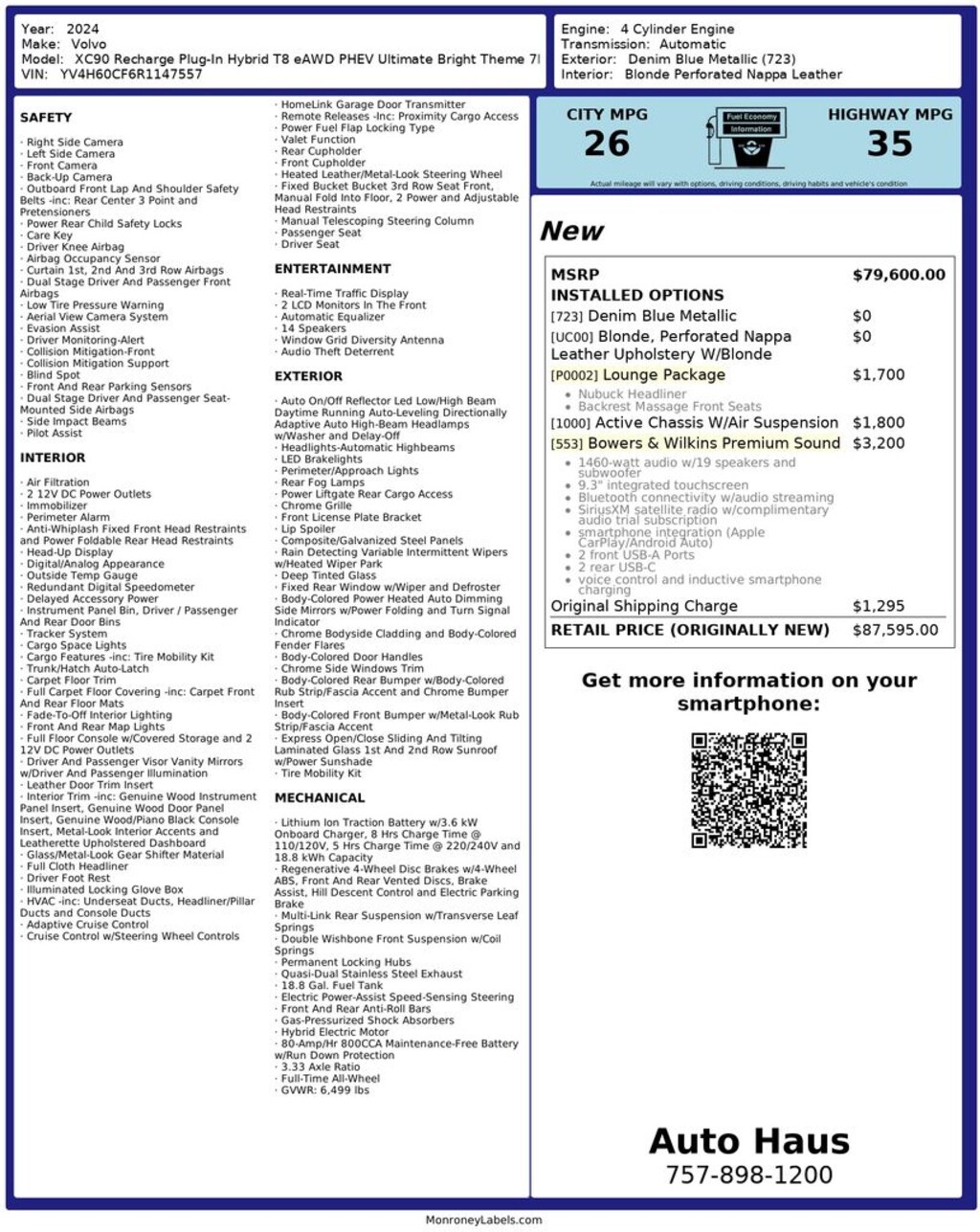 2024 Volvo XC90 Recharge Plug-In Hybrid Ultimate Denim Blue Metallic AWD Automatic with Geartronic 2.0L I4 Hybrid Turbocharged DOHC 16V LEV3-SULEV30 CARFAX One-Owner. Clean CARFAX.