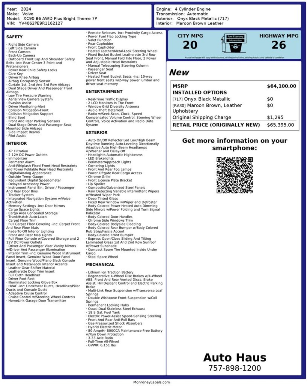 2024 Volvo XC90 B6 Plus Bright Theme Onyx Black Metallic AWD Automatic with Geartronic 2.0L I4 Turbocharged DOHC 16V LEV3-ULEV70 CARFAX One-Owner. Clean CARFAX.